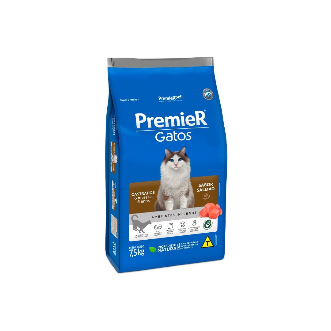 RAÇÃO PREMIER GATOS CASTRADOS 6 MESES A 6 ANOS SALMÃO Tamanho:7,5KG