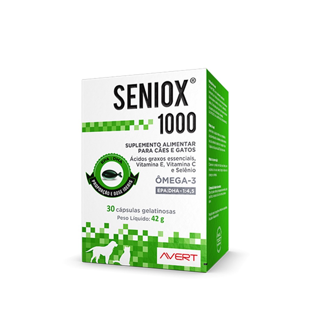 SENIOX 1000 é um suplemento alimentar composto por ácidos graxos essenciais derivados de óleos de peixes marinhos, vitamina C, vitamina E e selênio. É indicado para cães e gatos que necessitem do aporte.